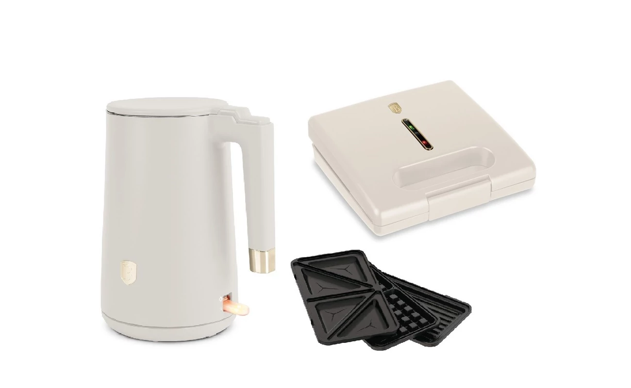 Stílus és praktikum egy csomagban! A Berlinger Haus Sahara szett két nélkülözhetetlen konyhai eszközt kínál: egy 3 az 1-ben Szendvics-, Gofri- és Grillsütőt, valamint egy elegáns Dupla falú Vízforralót.