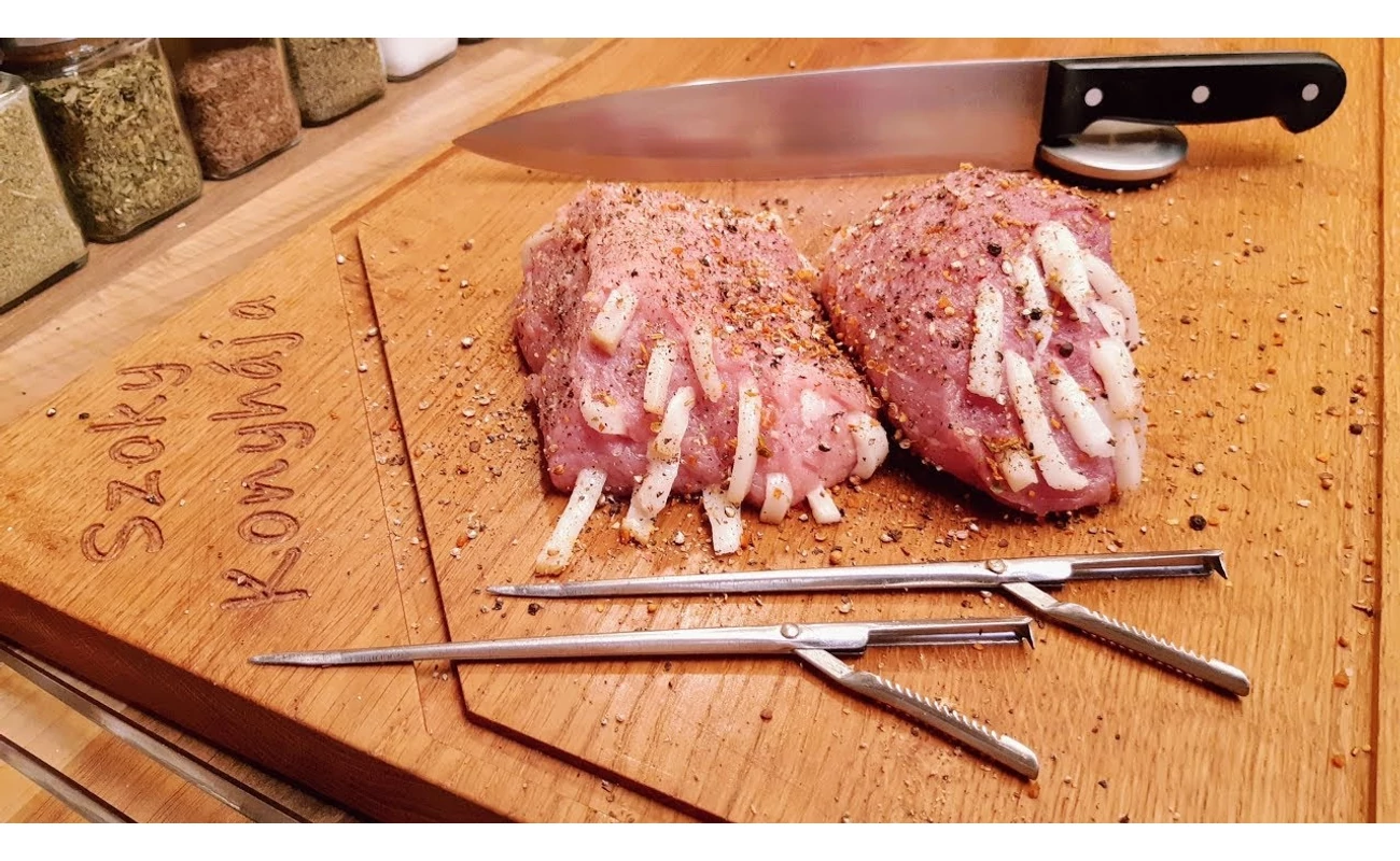 jó mélyen húzzuk be a húsba, hogy a szalonna belül süljön. Mindig a szálak irányában spékeljünk!